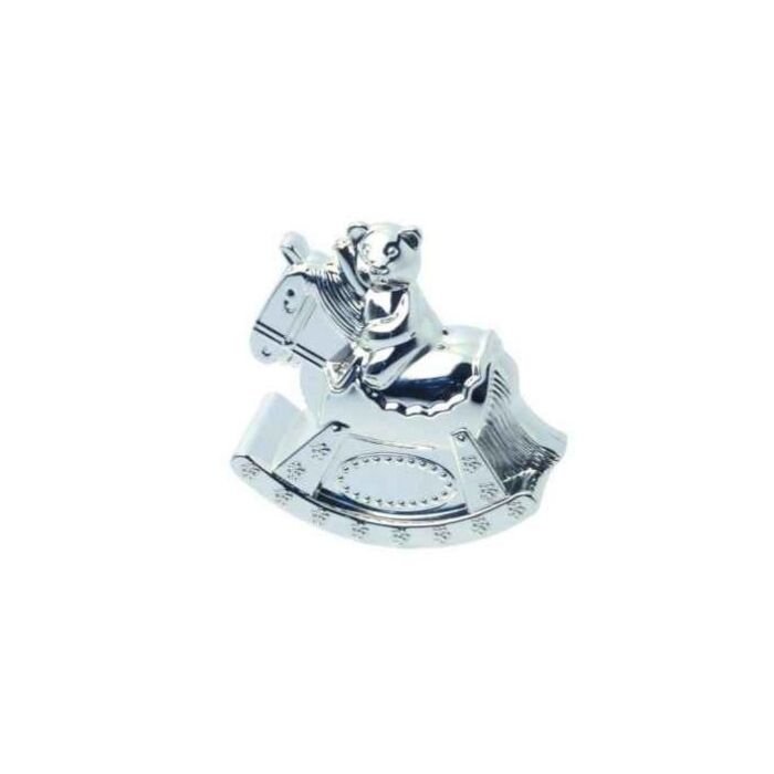 Verzilverde spaarpot hobbelpaard met beer. Leuk spaarpotje in de vorm van een hobbelpaard.